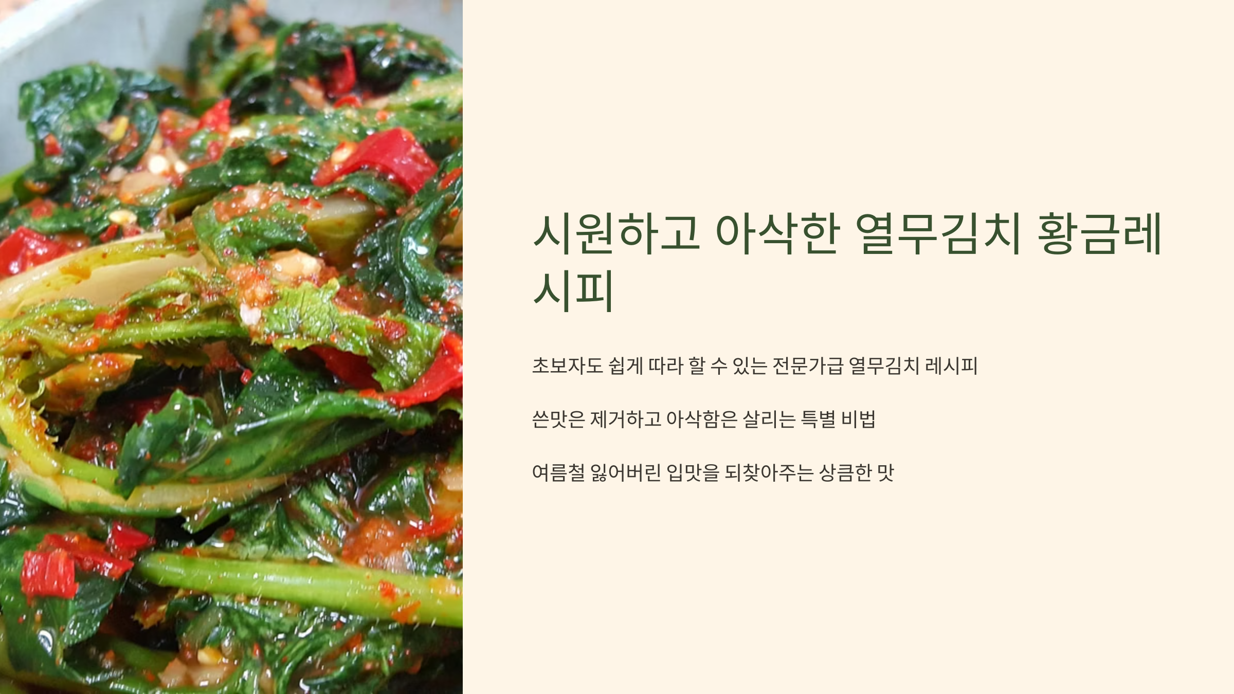 열무김치는 잘못 담그면 풋내 나거나 쓴맛이 나기 쉬운데요, 오늘 제가 알려드리는 열무김치 맛있게 담그는법황금레시피만 따라 하시면 초보자도 실패 없이 전문가급 열무김치를 완성할 수 있답니다! 쓴맛은 싹 잡고 아삭함은 살리는 비법, 지금부터 자세히 알려드릴게요. 📌